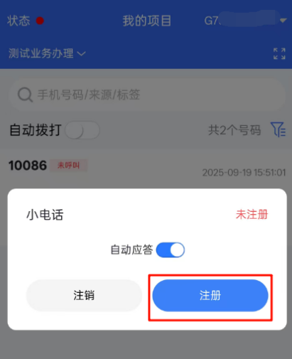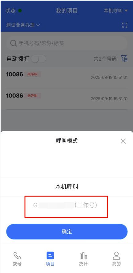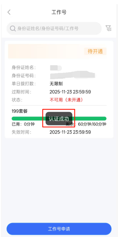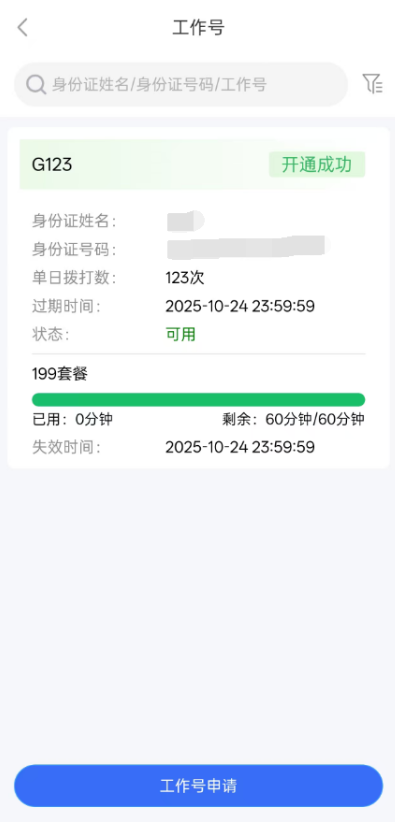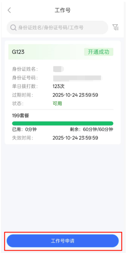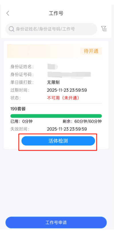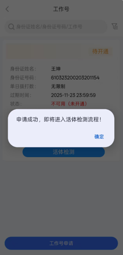 > 说明:可通过申请的工作号在手拨app拨打电话 ## 1、工作号入口 ### 1.1 点击工作号栏目进入工作号页面  ### 1.2 在工作号页面可查看已申请的工作号信息  ## 2、申请工作号 ### 2.1 点击底部工作号申请按钮进入工作号申请流程  ### 2.2 填写所需信息,点击申请  ### 2.3 点击确定进入活体检测流程  ### 2.4 勾选同意协议并点击开始认证  ### 2.5 若中途退出可点击工作号底部活体检测按钮重新进入活体检测流程  ### 2.6 完成活体检测  ## 3、使用工作号 ### 3.1 管理员审核完毕后工作号状态变为可用 > 说明:如审核不通过会将支付金额返还  ### 3.2 切换呼叫模式 #### 3.2.1 点击上方本机呼叫  #### 3.2.2 选择工作号并点击确定  ### 3.3 注册工作号 #### 3.3.1 点击左上角状态  #### 3.3.2 点击注册  #### 3.3.3 注册成功后左上角状态变为绿色,此时拨打电话使用工作号  ### 3.4 工作号拨打电话