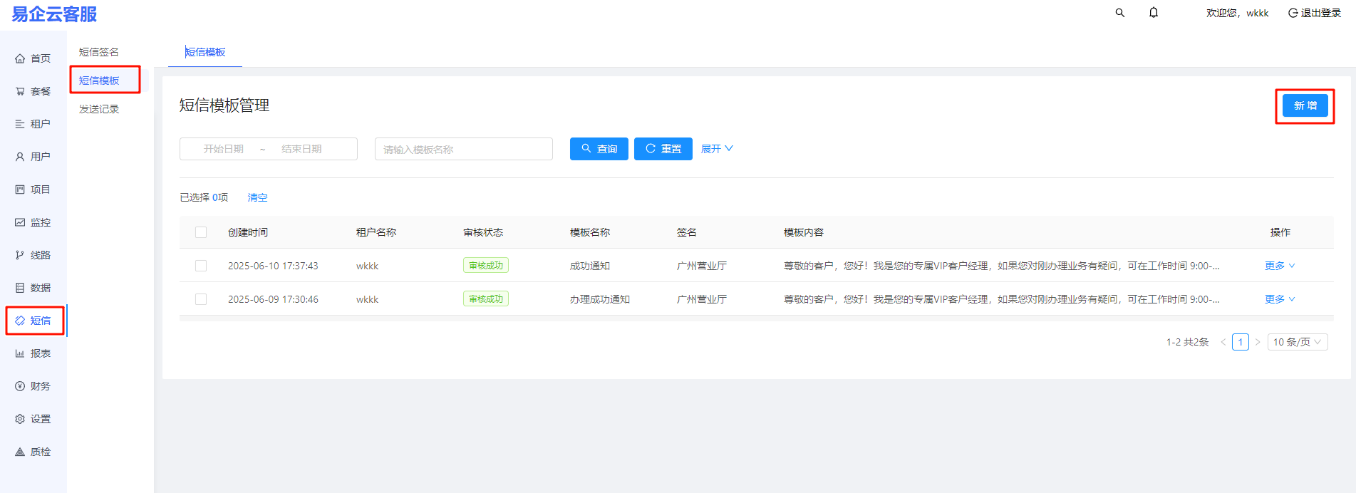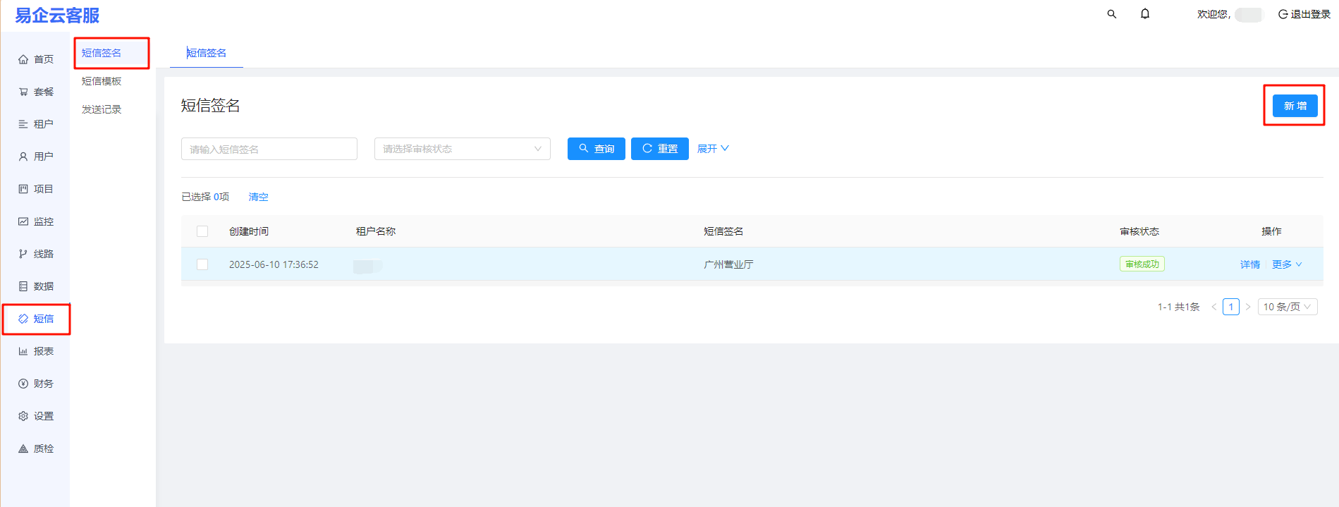 > 说明:在坐席结束通话并标记成功时发送短信给客户 ## 1、申请签名 > 说明1:新增的的签名需要等待审核,审核过后才可以使用 说明2:签名是所发送的短信的前置信息  ### 1.1 在短信签名页面点击新增按钮  ### 1.2 输入签名并点击确定  ## 2、新增短信模板 > 说明:短信模板是短信的内容信息,可填写参数,审核过后才可以使用 ### 2.1 在短信模板页面点击新增按钮  ### 2.1 根据提示填写所需信息  ## 3、项目短信设置 > 项目设置发送短信后该项目坐席在挂断电话并标记成功后会发送短信给客户 ### 3.1 在项目管理页面->项目->更多处点击短信设置  ### 3.2 选择项目的短信发送方式  ### 3.3 选择短信模板,填写参数并点击确定