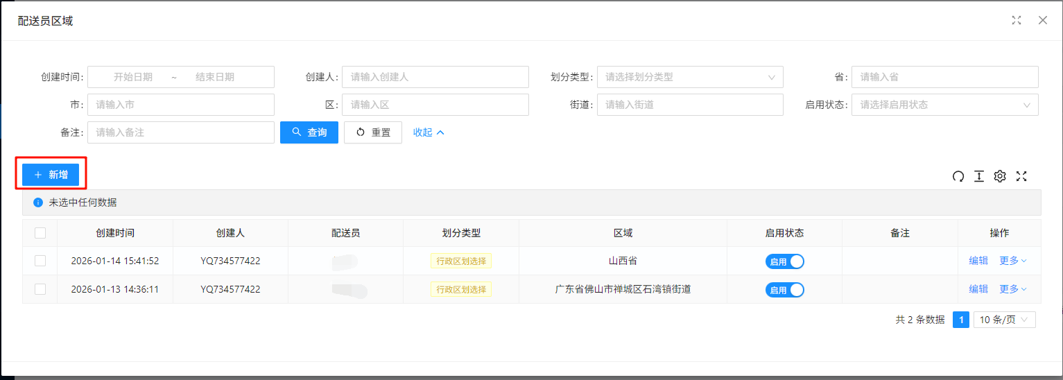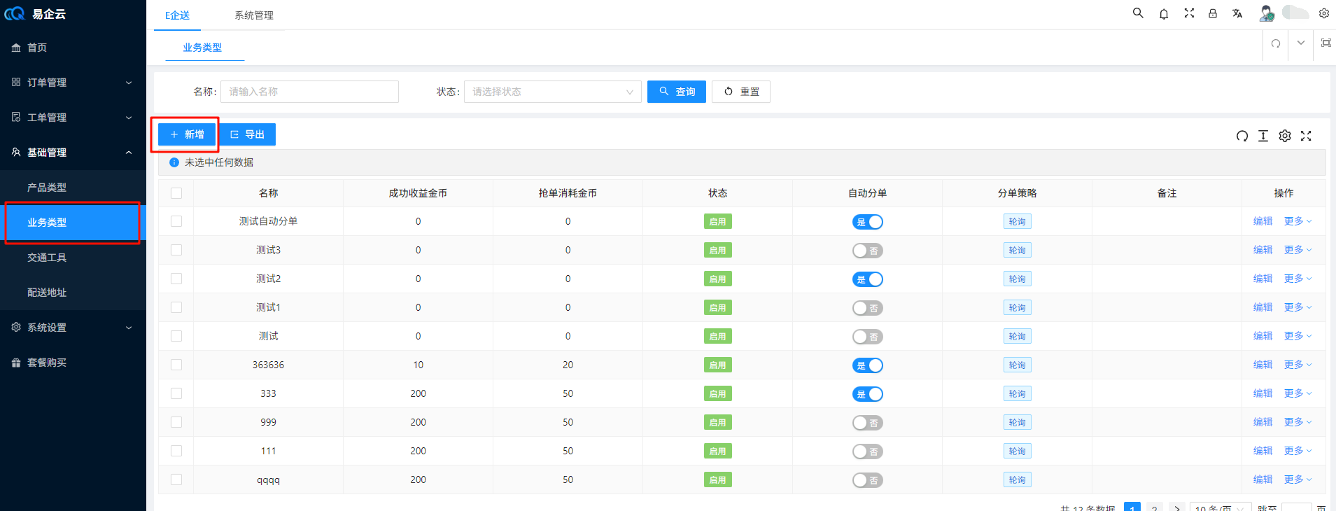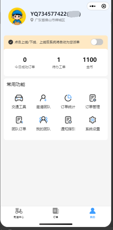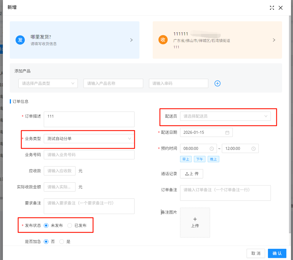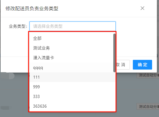 > 订单(未发布,无配送员)在创建后,由系统自动根据配送员负责的业务类型与区域将订单分配给配送员 ## 1、创建自动分单的业务类型 ### 1.1 在业务类型页面点击新增  ### 1.2 填写对应信息并选择开启自动分单,点击确认  > 分单策略说明: 1、轮询:根据配送员在这个业务类型最后自动分配时间轮流分配给分配时间最久的配送员 ## 2、修改配送员负责的业务类型 ### 2.1 在配送员管理页面选择配送员,点击修改负责业务类型  ### 2.2 选择一个业务类型,点击确认 > 说明:选择全部代表该配送员负责所有业务  ## 3、修改配送员负责的区域 ### 3.1 在配送员管理页面点击负责区域  ### 3.2 在弹窗中点击新增  ### 3.3 填写区域信息,点击确认  ## 4、修改配送员上线状态 > 说明:只有上线的配送员系统才会为其自动分配订单 ### 方式1:配送员在配送中心点击上线按钮进行上线  ### 方式2:配送员在我的页面点击开关进行上线  ### 方式3:业务员在配送员管理页面点击开关进行上线  ## 5、创建一个未发布、无配送员、业务类型开启了自动分单功能的订单  ## 6、一分钟左右后自动分单完成