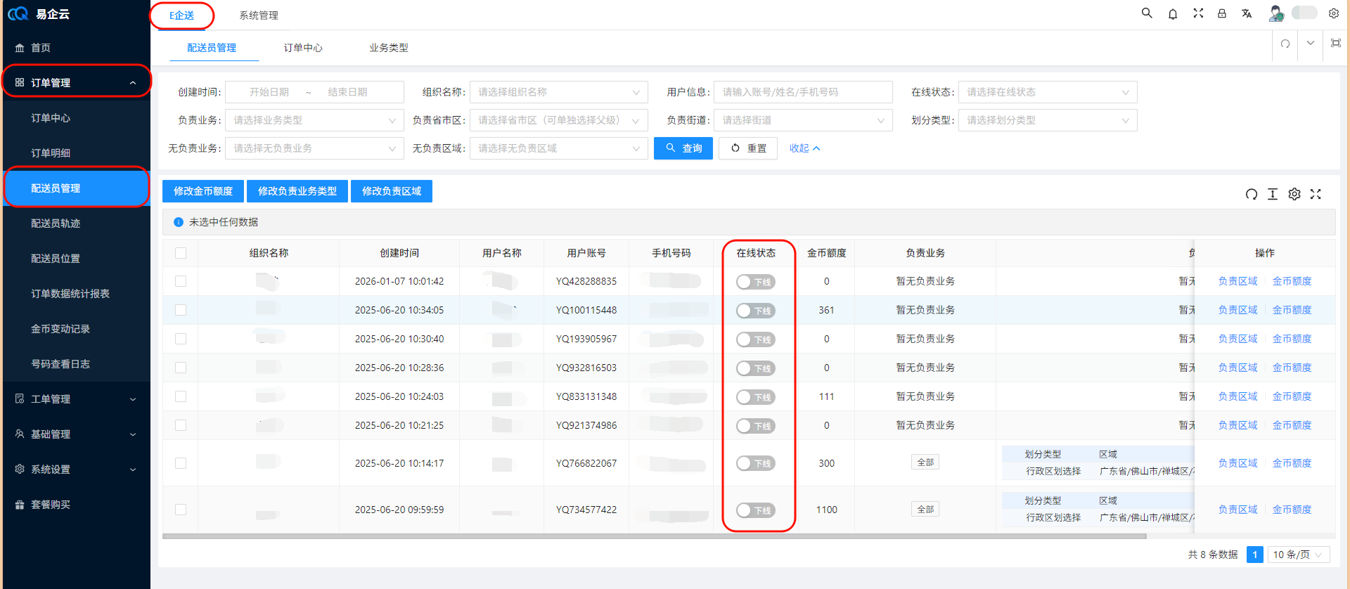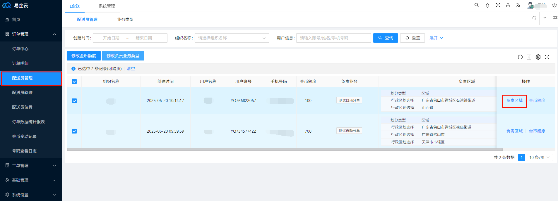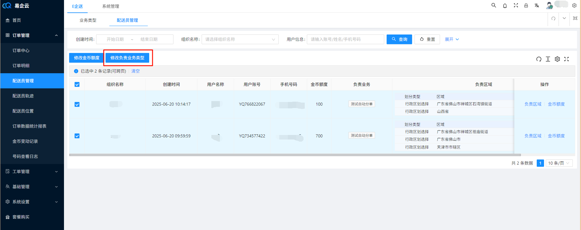 > 订单(未发布,无配送员)在创建后,由系统自动根据配送员负责的业务类型与区域将订单分配给配送员 ## 1、创建自动分单的业务类型 ### 1.1 在业务类型页面点击新增  ### 1.2 填写对应信息并选择开启自动分单,点击确认  > 分单策略说明: 1、轮询:根据配送员在这个业务类型最后自动分配时间轮流分配给分配时间最久的配送员 ## 2、修改配送员负责的业务类型 ### 2.1 在配送员管理页面选择配送员,点击修改负责业务类型  ### 2.2 选择一个业务类型,点击确认 > 说明:选择全部代表该配送员负责所有业务  ## 3、修改配送员负责的区域 ### 3.1 在配送员管理页面点击负责区域  ### 3.2 在弹窗中点击新增  ### 3.3 填写区域信息,点击确认  ## 4、修改配送员上线状态 > 说明:只有上线的配送员系统才会为其自动分配订单 ### 方式1:配送员在配送中心点击上线按钮进行上线  ### 方式2:配送员在我的页面点击开关进行上线  ### 方式3:业务员在配送员管理页面点击开关进行上线  ## 5、创建一个未发布、无配送员、业务类型开启了自动分单功能的订单  ## 6、一分钟左右后自动分单完成