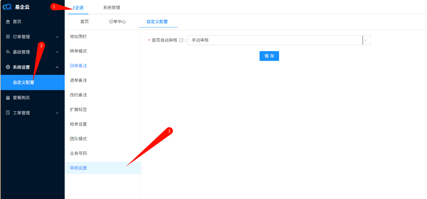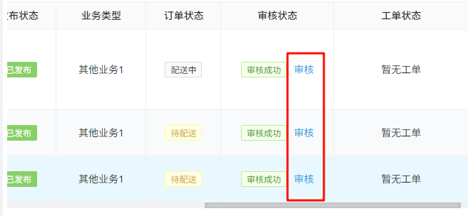 > 说明1:可以对订单进行审核,订单具有三种审核状态(待审核、审核成功、审核失败) > 说明2:审核状态仅作为一个标识,无实际限制作用 ## 1、审核订单 ### 1.1 打开订单中心页面  ### 1.2 找到审核状态列、点击审核或点击详情、审核按钮    ### 1.3 选择审核状态、点击确定  ## 2、自动审核 > 可设置订单创建时自动审核成功,通过自定义配置开启 ### 2.1 打开自定义配置页面、点击审核设置  ### 2.2 选择自动审核、点击保存